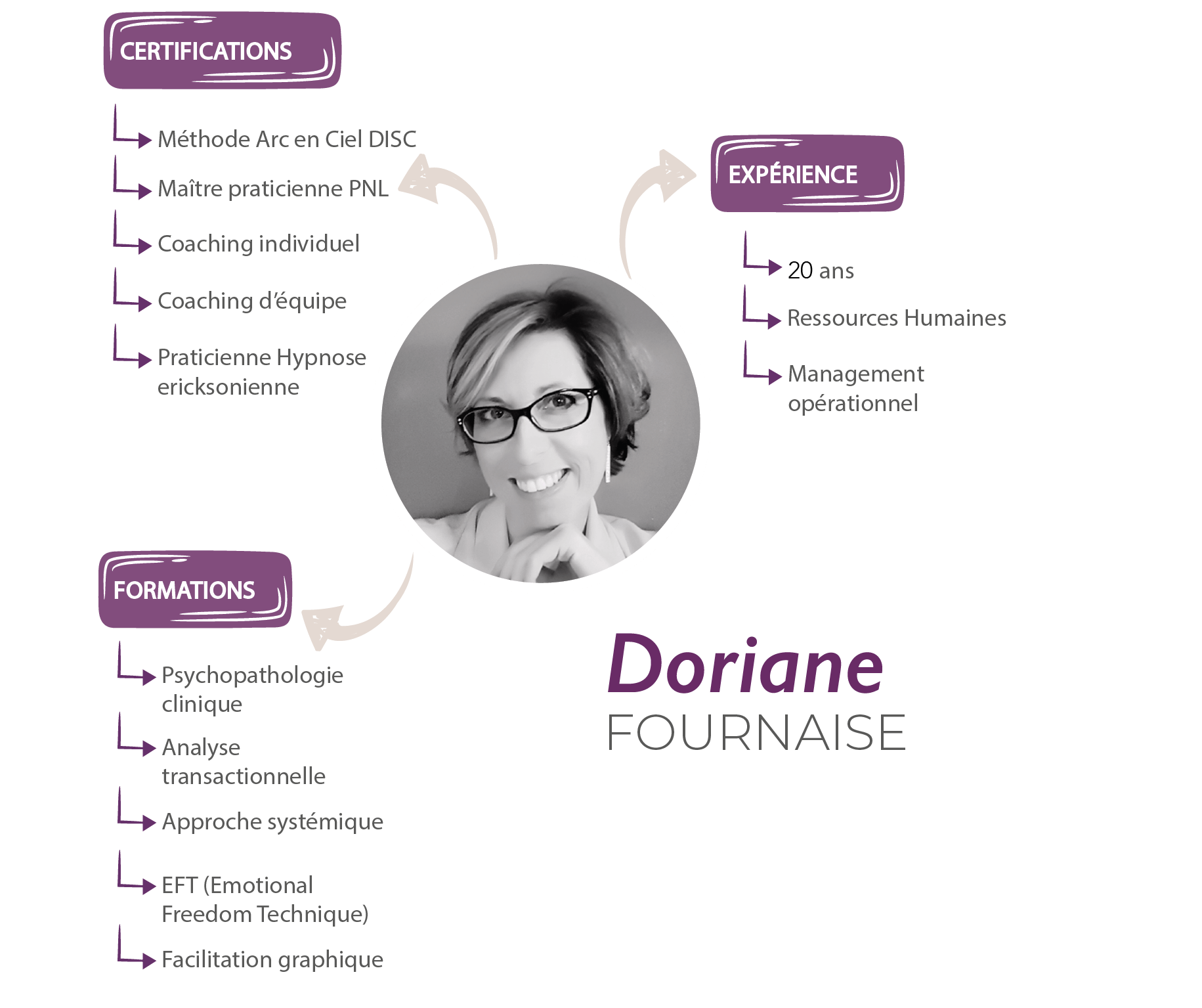 Forte d’une formation universitaire en droit social et de plus de 15 années d’expérience dans les Ressources Humaines et en tant que manager opérationnel, Doriane Fournaise met à votre profit son parcours de terrain, conjugué à des outils tels que la PNL, la systémie, l’analyse transactionnelle, la psychopathologie, l’hypnose ericksonienne...